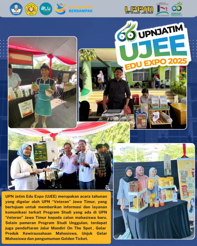 UPN Jatim Edu Expo (UJEE) merupakan acara tahunan yang digelar oleh UPN “Veteran” Jawa Timur, yang bertujuan untuk memberikan informasi dan layanan komunikasi terkait Program Studi yang ada di UPN ‘Veteran” Jawa Timur kepada calon mahasiswa baru. Selain pameran Program Studi Unggulan, terdapat juga pendaftaran Jalur Mandiri On The Spot , Gelar Produk Kewirausahaan Mahasiswa, Unjuk Gelar Mahasiswa dan pengumuman Golden Ticket.